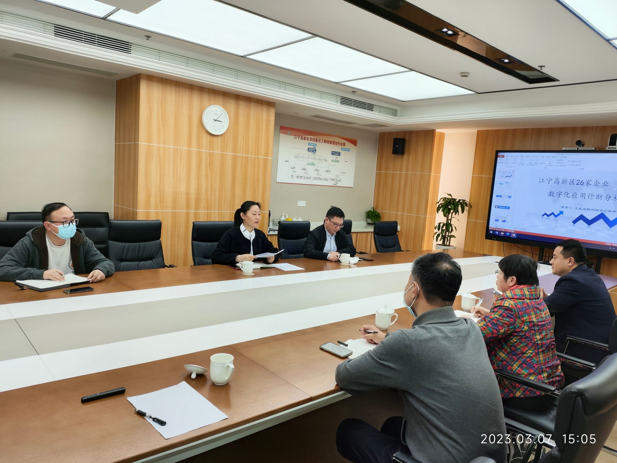 2023年3月7日下午,南京5G+工业互联网融合创新中心(以下简称“融创中心”)主任、BBIN宝盈官网副董事长张燕,合作单位中国联通南京市分公司江宁区总经理宋桂宁一行,前往江宁高新区向江宁高新区管委会副主任李娟、江宁高新区经济运行部部长夏欢等领导汇报园区参诊企业数字化应用情况。