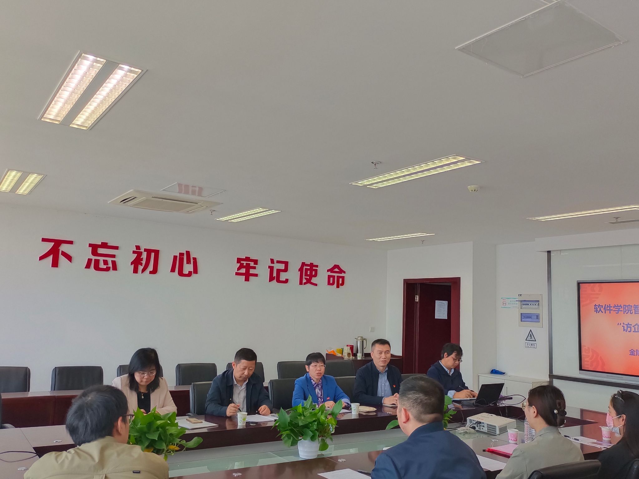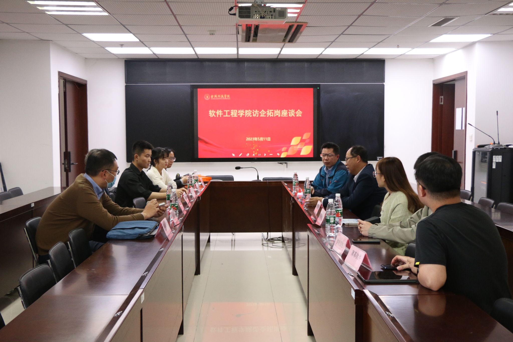 现场招聘会后,学院召开了两场企业交流会,将访企拓岗“走出去”与“请进来”结合起来,实现校企双方“双向奔赴”促就业。智能科学技术专业方向与8家企业在科技楼1-2005会议室举行第一场“访企拓岗”交流会。副董事长张燕、公司党委书记徐志国、副经理胡勇、智能科学与技术系主任赵海峰以及相关教师参加会议。